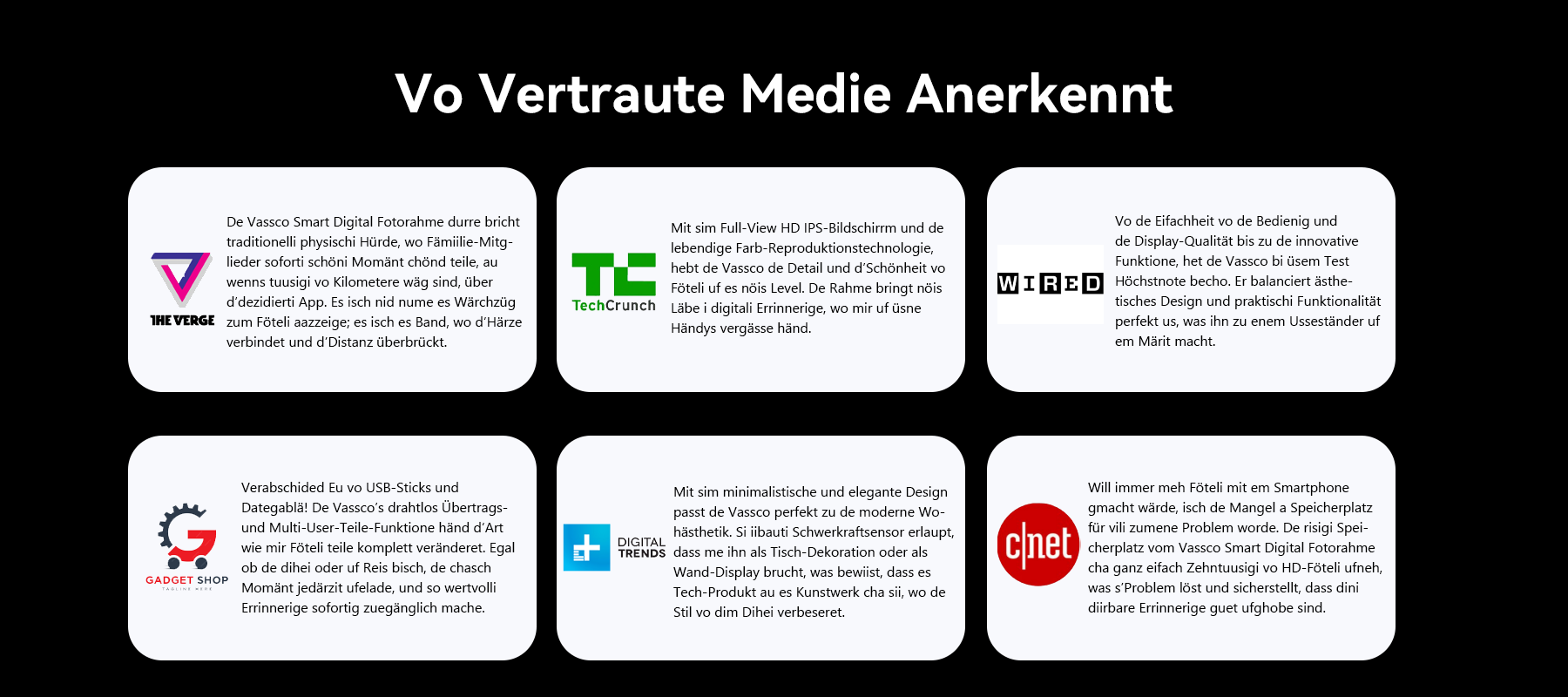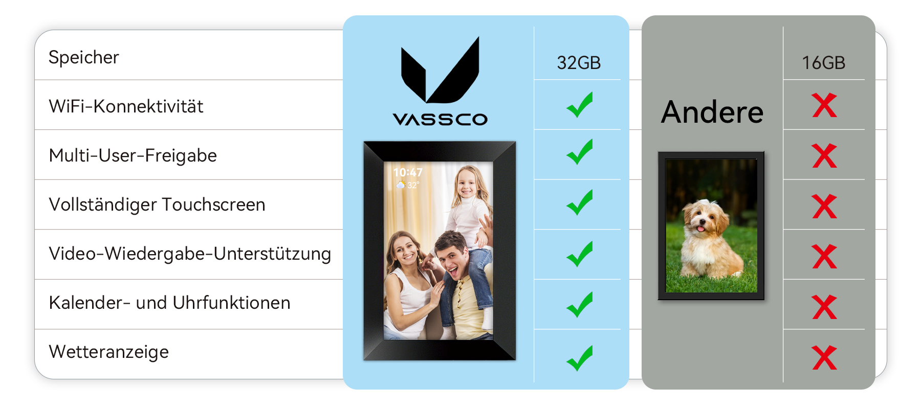 Das Ergebnis war der Vassco Smart Photo Frame – mit leistungsstarkem WLAN und einem einfachen, benutzerfreundlichen Design, das das Teilen mühelos macht und gleichzeitig jeden Moment in lebendiger HD-Qualität anzeigt. Die Mission von Vassco ist klar: digitalen Ballast in die Freude am Teilen zu verwandeln, damit Sie sich auf die Erinnerungen konzentrieren können, nicht auf die Technologie.