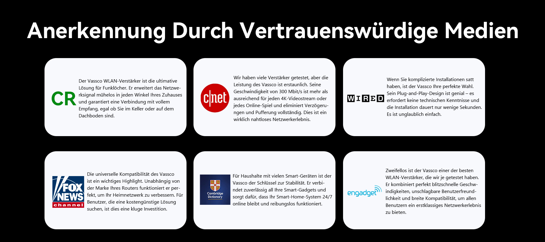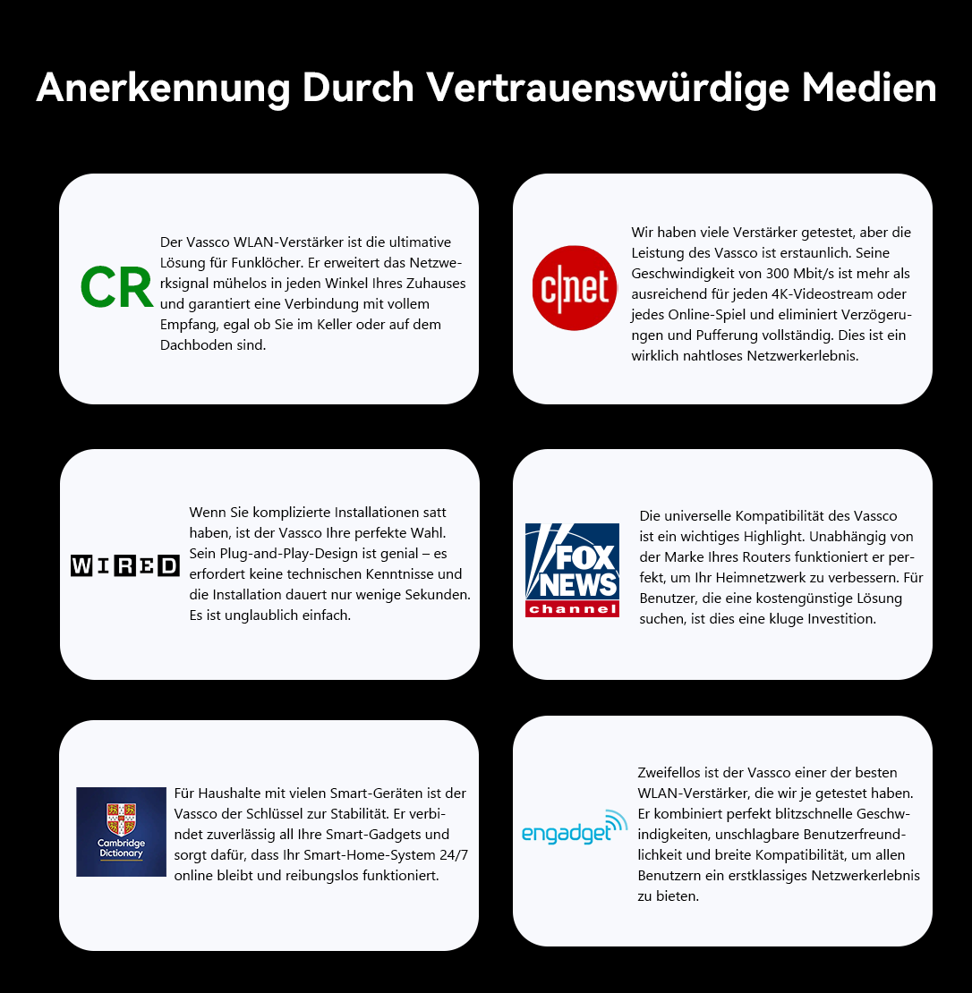 Das Ergebnis ist der Vassco WiFi Extender. Das einzige Ziel dieses Repeaters ist es, die WLAN-Reichweite Ihres Zuhauses zu erweitern und Funklöcher zu eliminieren. Er verfügt über eine High-Penetration-Dual-Antenna-Technologie und ein Plug-and-Play-Design, das ein stabiles, schnelles Netzwerk in jedem Raum und für jedes Gerät gewährleistet. Das ist Vasscos Kernversprechen: Ihr Netzwerk in jeden Winkel Ihres Zuhauses zu bringen.